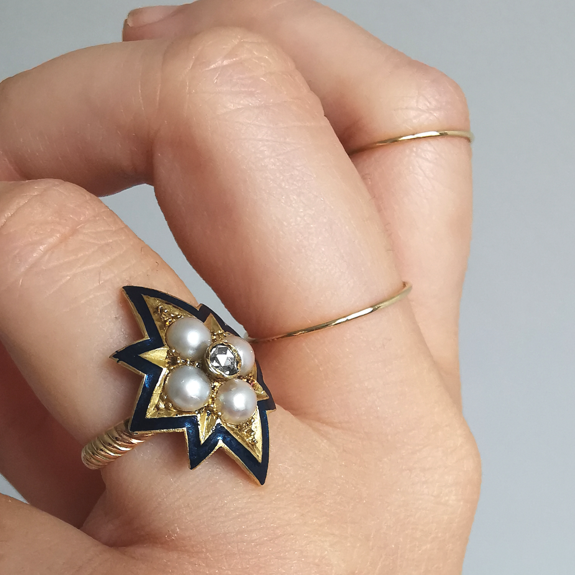 Features: This star ring is set in 18k gold, Shank is a later addition and set in 14k gold, split seed pearls, rose cut diamond