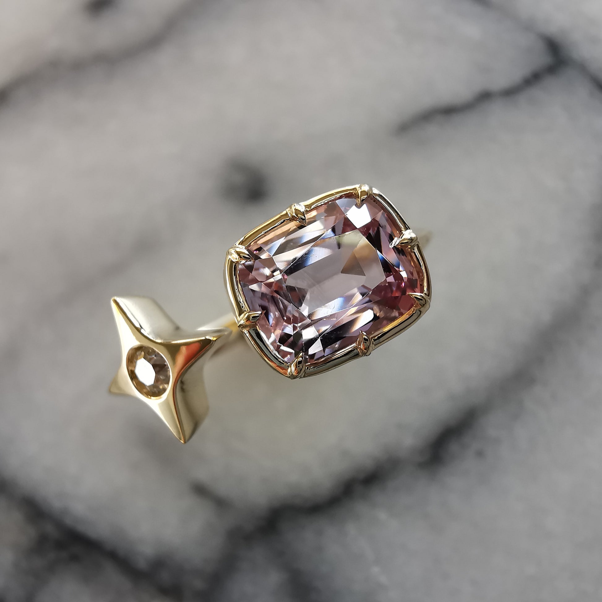 A beautiful bespoke jewel created by us for a wonderful lady, featuring a natural and untreated baby pink spinel and antique diamond set in a buttery 18k yellow gold and collet setting.