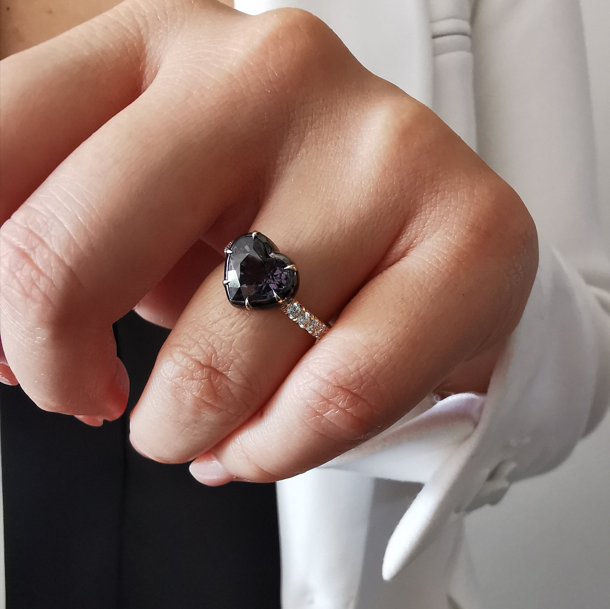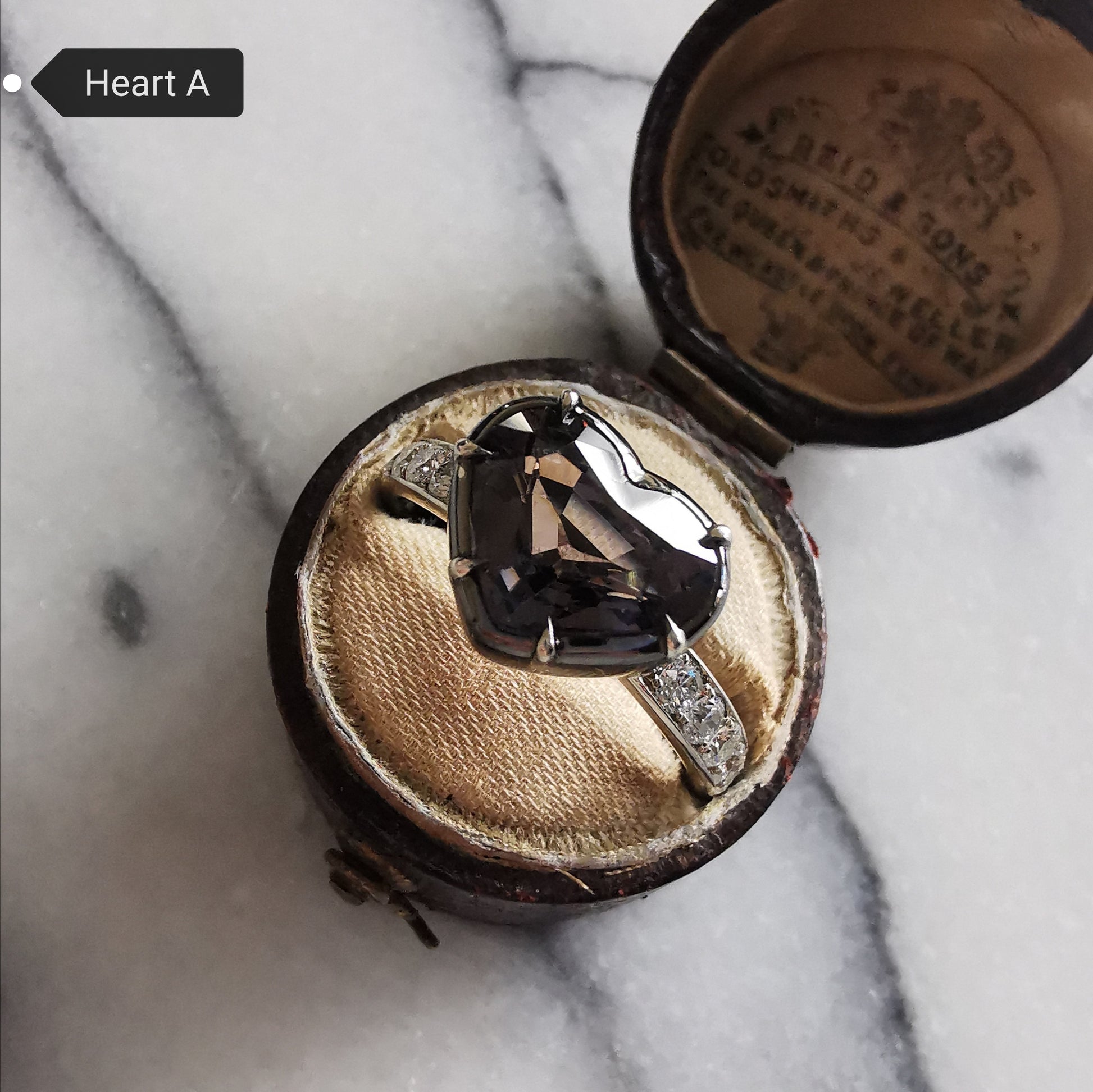This heart ring is an 1801 exclusive design, set with a Georgian inspired collet, sparkling diamonds and a untreated metallic grey spinel heart from Myanmar Burma. A beautiful patina has been applied to the collet for an old world feel and will naturally wear down to a a beautiful finish with love.