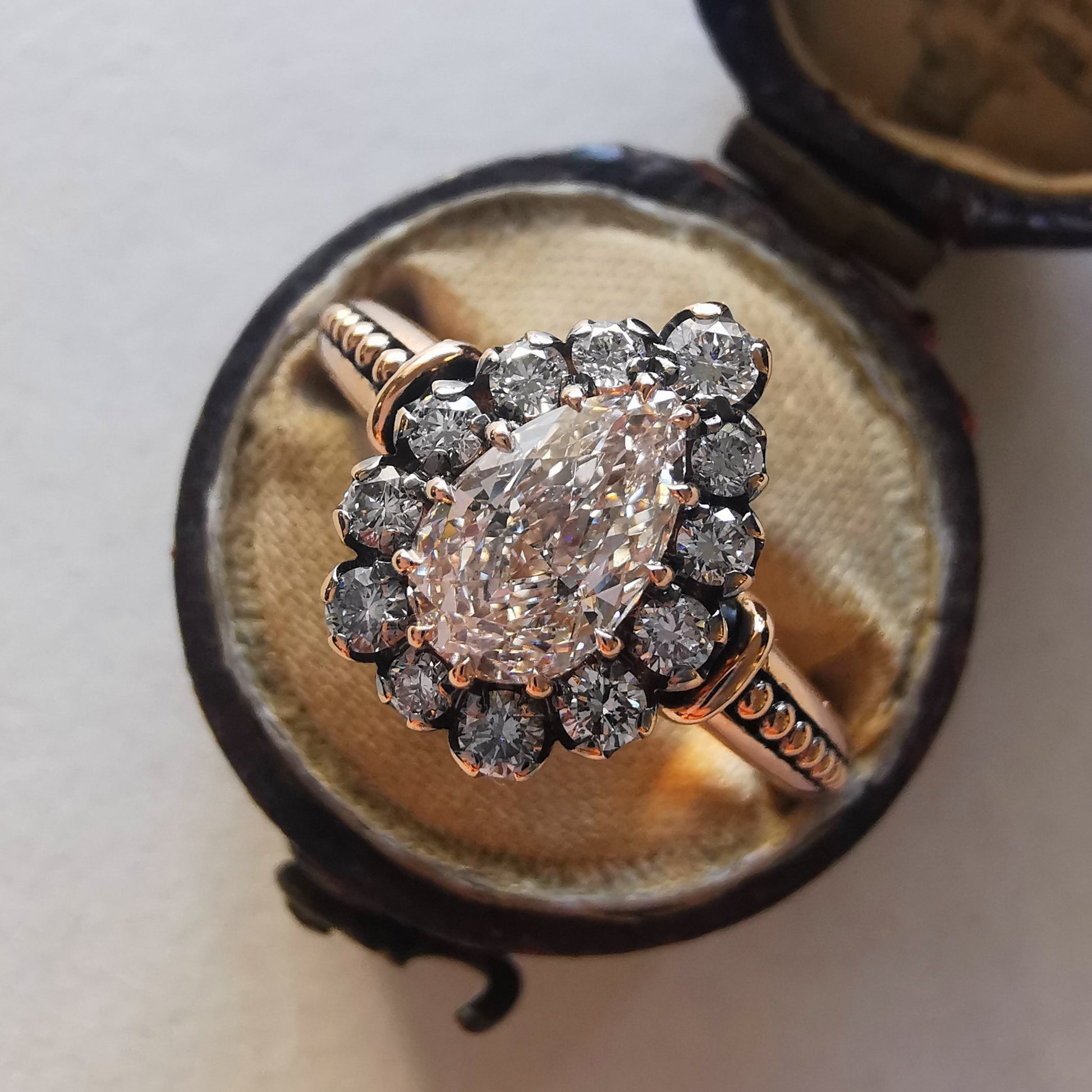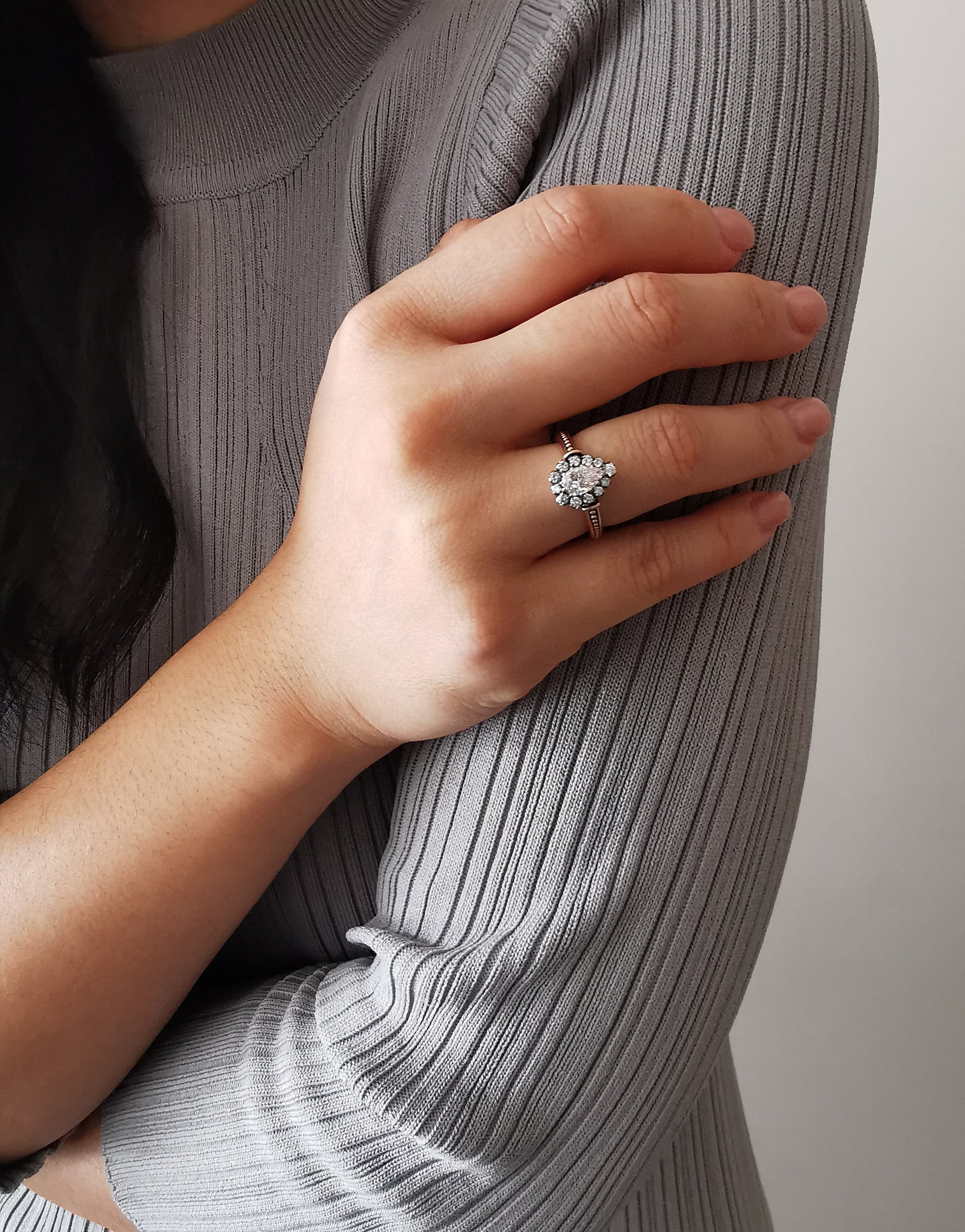 Inspired but the pink shades of a setting sun. This one of a kind sparkle bomb features an incredible 0.71ct light pink brown GIA certified natural and untreated pear shaped diamond. It is complimented by 0.31ctw of G VS Natural Diamonds, an antique inspired rose gold shank and patina applied for depth and dimension.