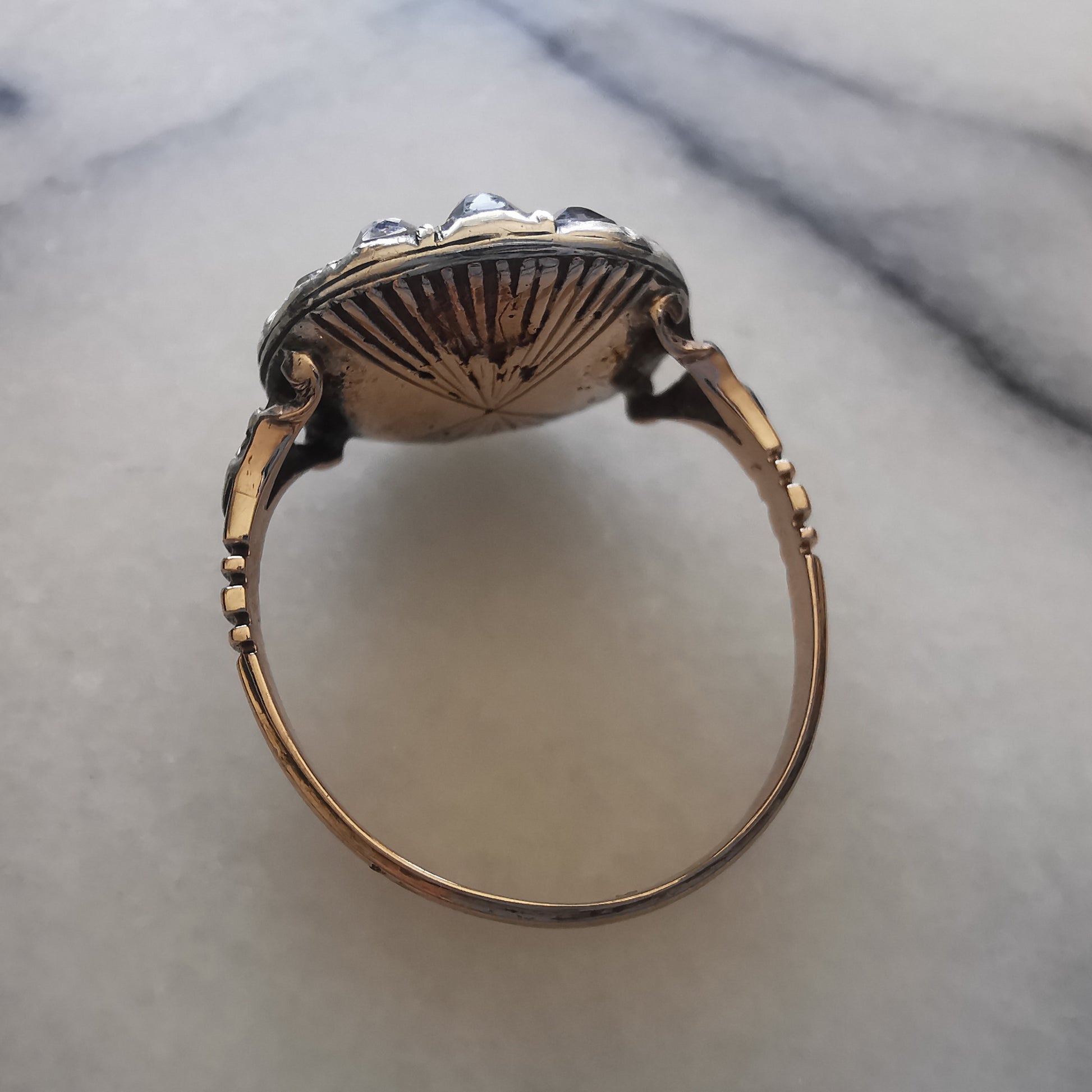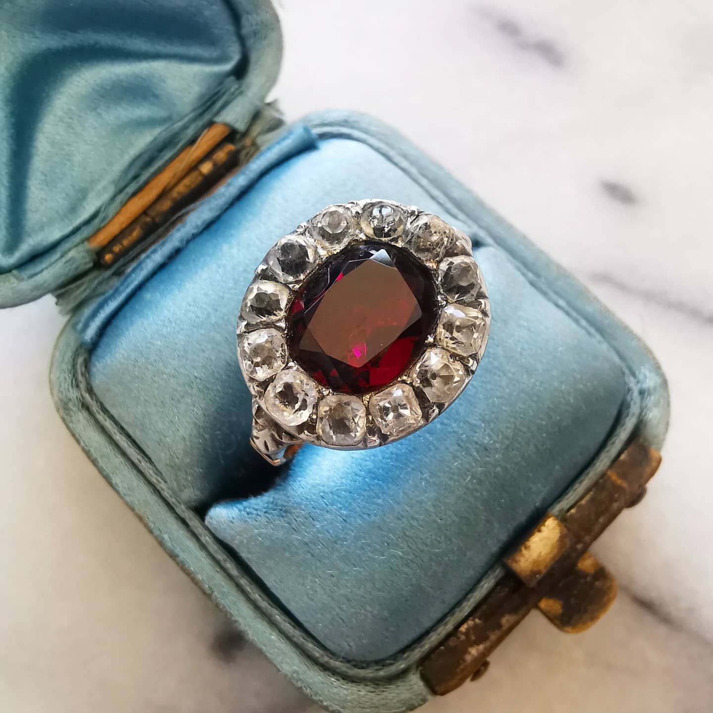 Features: Garnet centre, Quartz black dot halo, 14k gold shank, stones set in silver