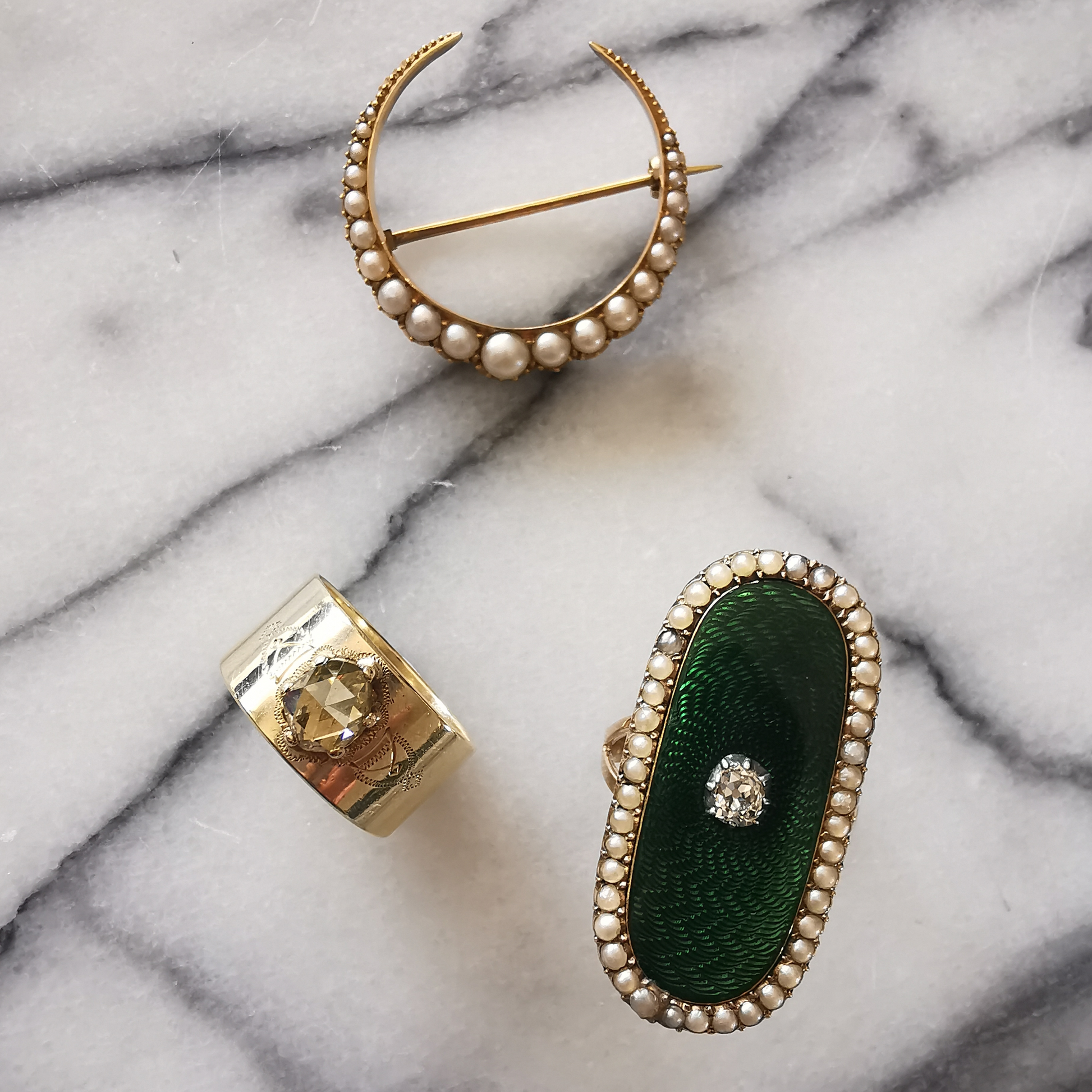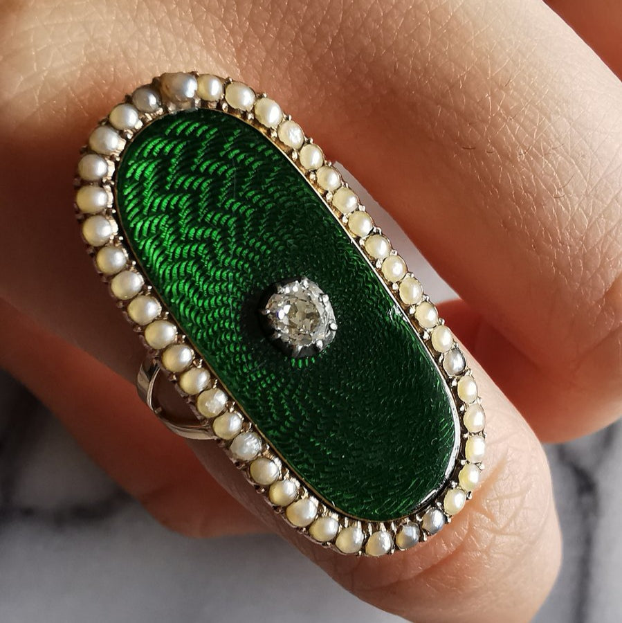 This late 18th century guilloche ring features green enamel, a central old mine cut diamond and natural seed pearls.