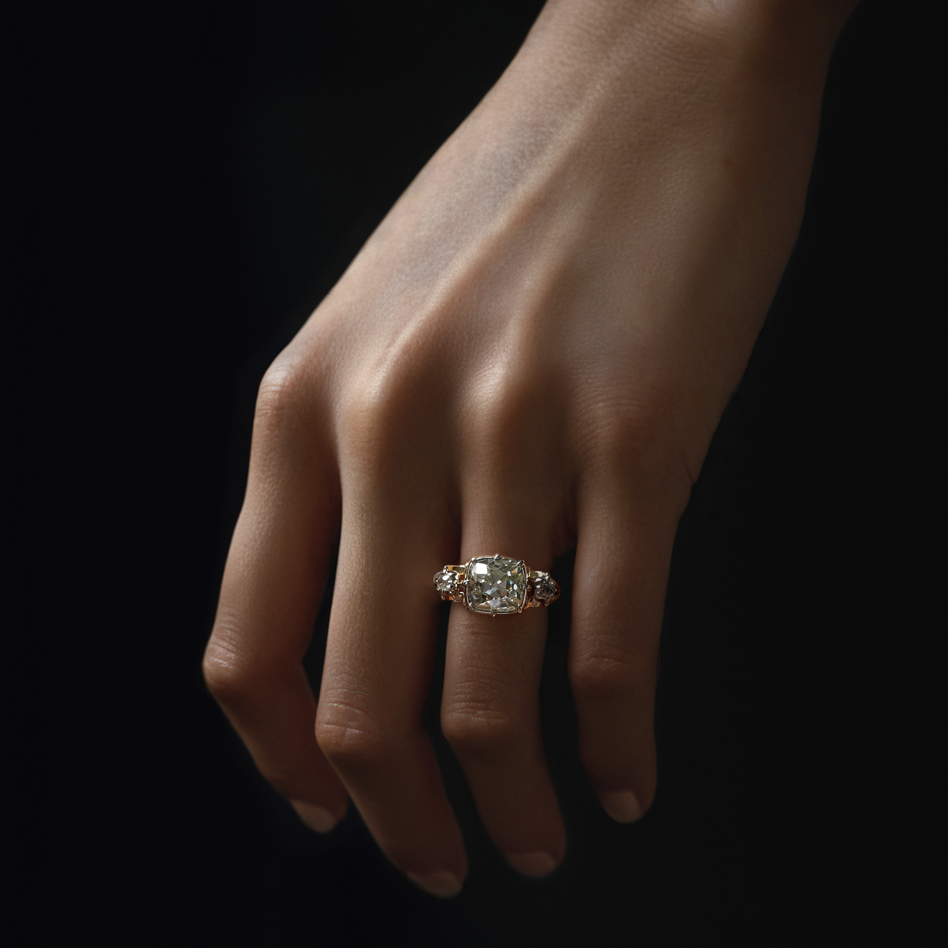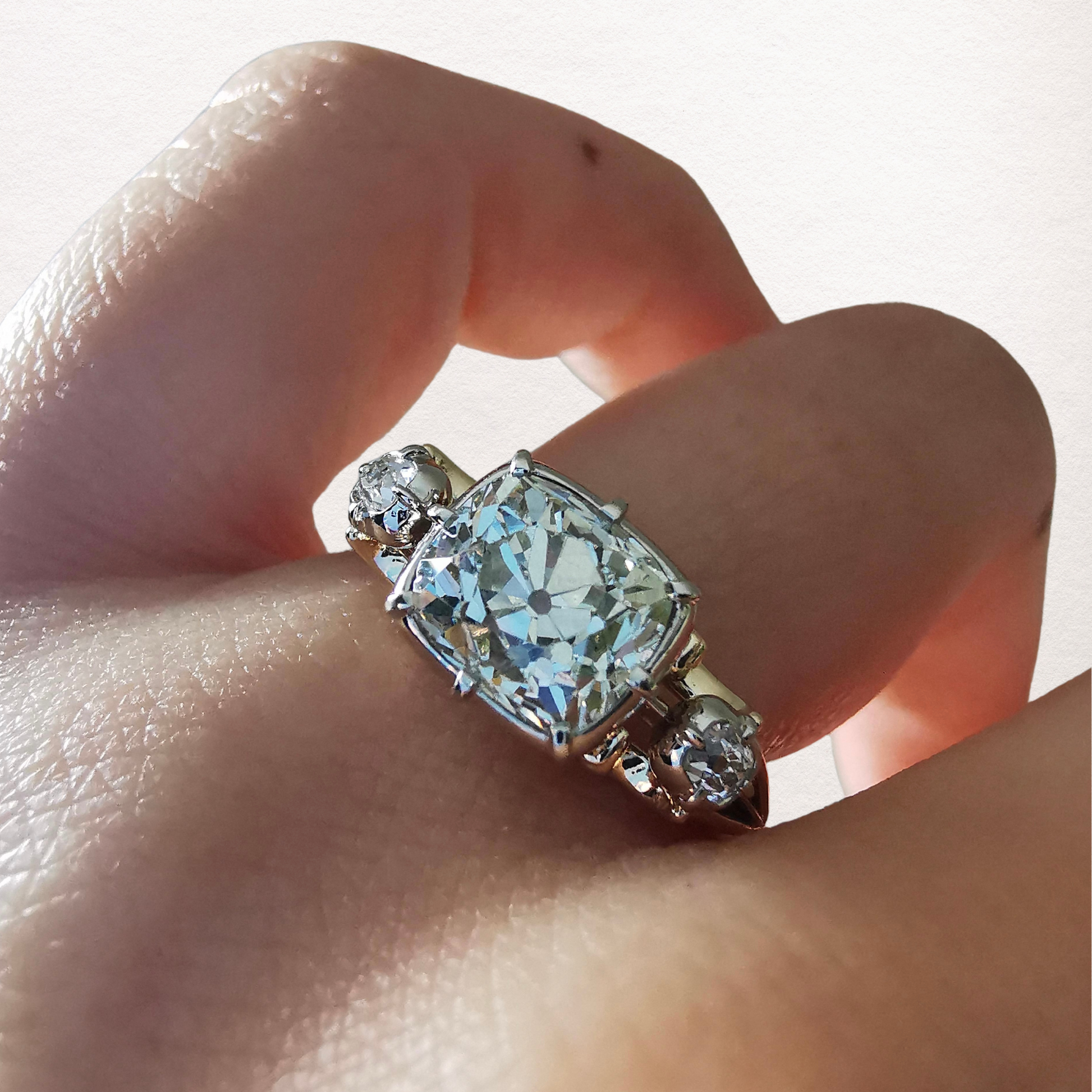 The ring displayed is set with a 1.9 carat antique old mine cut diamond.