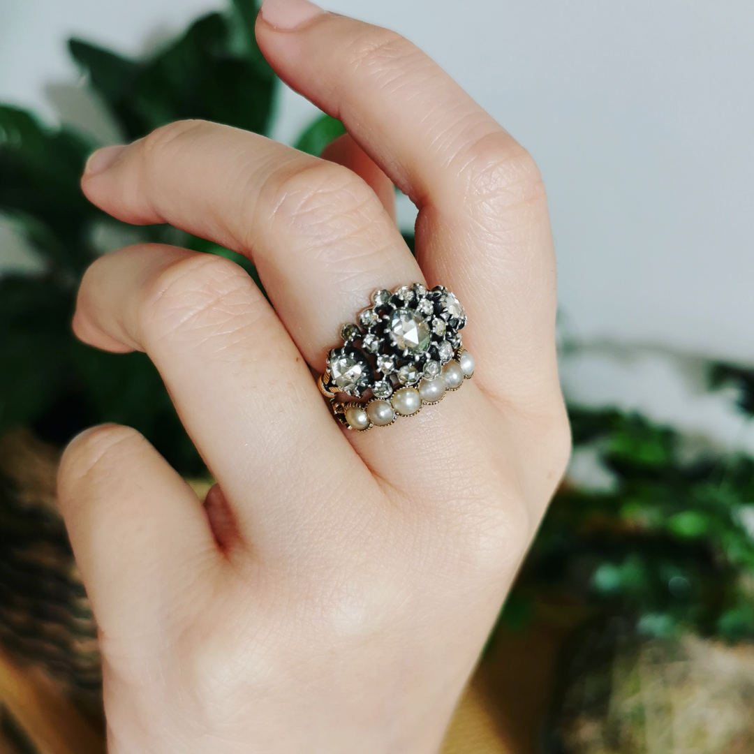 This 200 year old beautiful Georgian natural split pearl half hoop ring is in wonderful condition. The 6 natural split seed pearls range from a cream to light whimsical grey and are all original. Set in 15ct solid gold and dated circa 1810 -1820