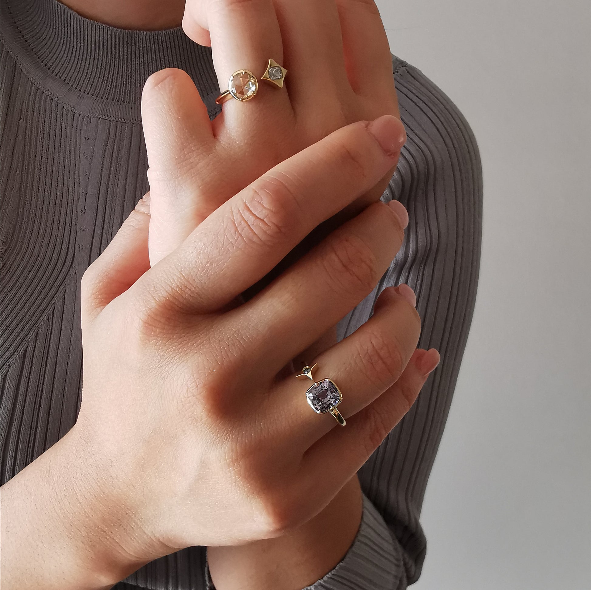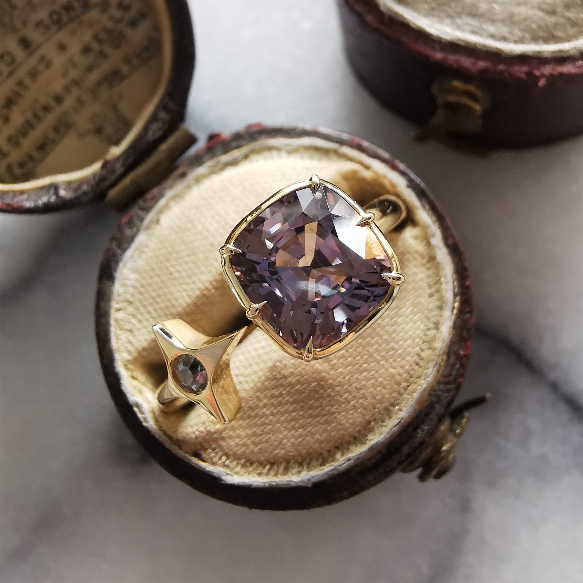 Let this ring be your lucky star. Inspired by celestial motifs, this ring features a beautiful untreated natural spinel from Myanmar Burma and a tension sent antique old mine cut diamond. Each Lucky Star ring is unique and created with love and care.